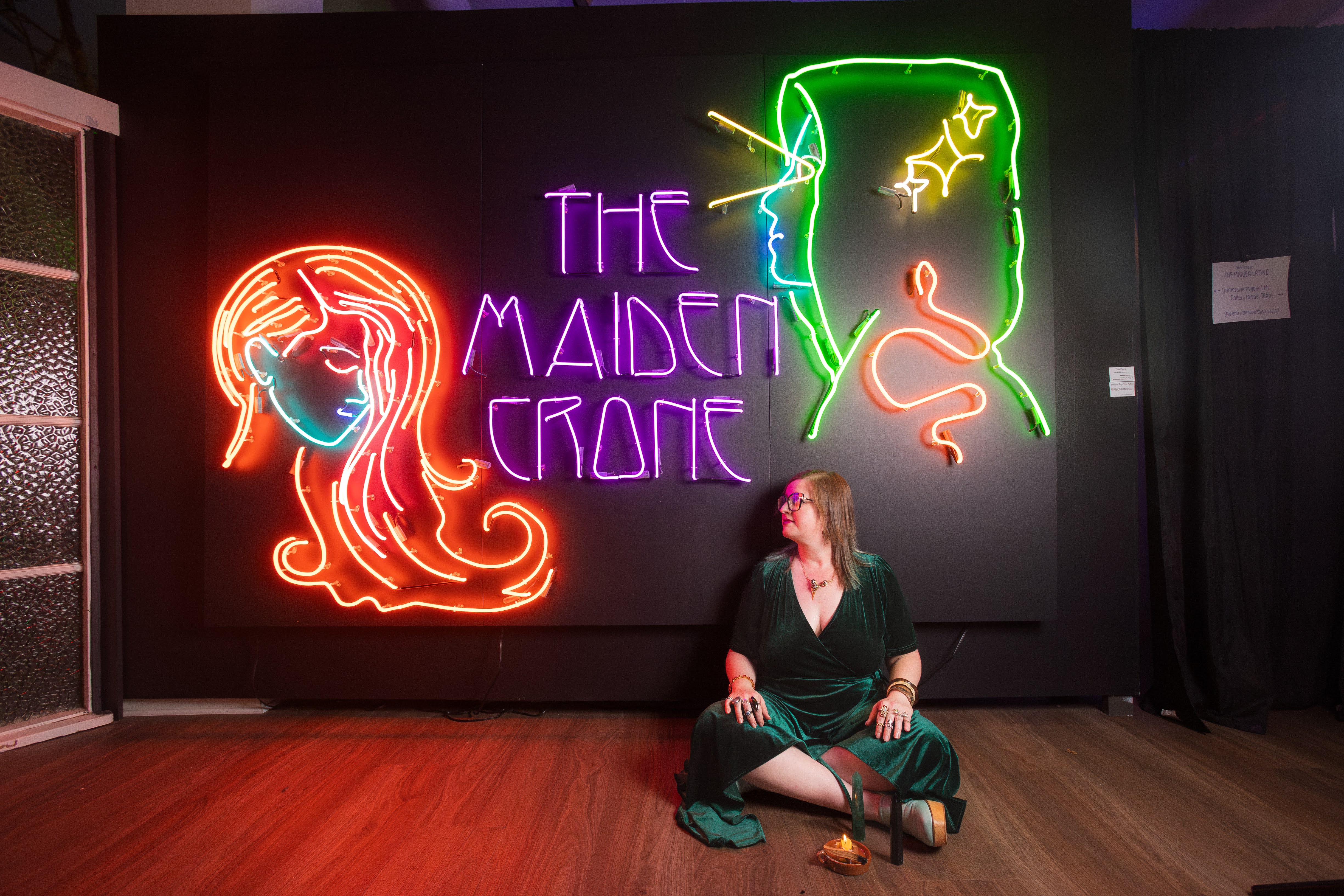 A neon sign on a black wall. Purple text in the center reads THE MAIDEN CRONE, between a portrait of a young woman with red hair on the left, and and old woman in a green hood on the right. The artist, Alleson, is seated in front of the wall, wearing a green dress. There is a lit candle on the floor in front of her.