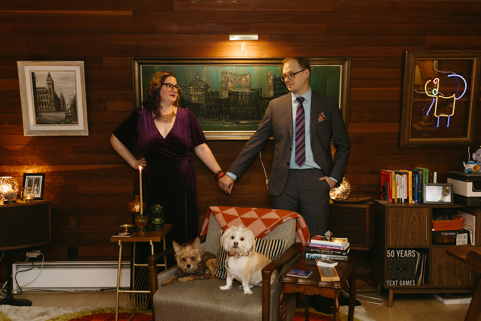Alleson, Brad, and their two dogs smile at the camera from within "The Maiden Crone" set.